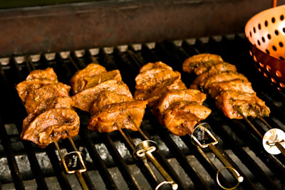When ready to cook, preheat grill to medium-high. (You can only hold your hand there for a few seconds at that heat.) Put meat tightly on skewers and let it come to room temperature while the grill heats.