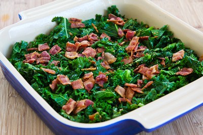 Put the wilted kale in the bottom of a sprayed casserole dish and top with the crumbled bacon.