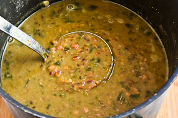 When the black-eyed peas are as sort as you'd like, remove the ham rind and then use an immersion blender to partially puree the soup, being careful not to overdo it if you want a soup with some chunkiness to it. Add the red pepper flakes and vinegar and simmer 10 minutes more (or longer; I sometimes cook it an hour or so longer at this point.) Serve hot and enjoy the good luck!