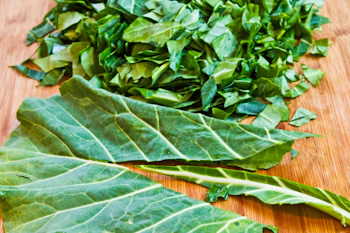 While the soup simmers, cut away the thick inner rib of the collard greens, then coarsely chop the greens.