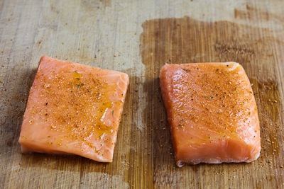 (Instead of marinating, you can also simply rub the salmon with olive oil and fish rub. I like both Szeged Fish Rub and Kirkland Herbed Seafood Rub.)