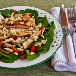 | A main-dish spinach salad with chicken, mushrooms, peppers, and almonds. |