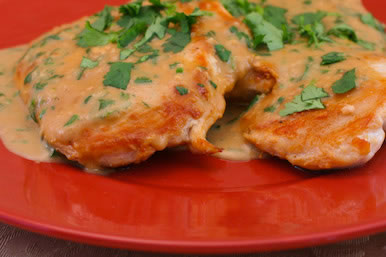 Stir in any juices that have accumulated on the plate and simmer another minute or so, then turn off the heat and stir in most of the chopped cilantro, saving a little to garnish if desired. Serve chicken with the sauce spooned over.
