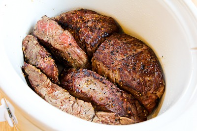 Put the pieces of meat into the slow cooker, trying to get them in a single layer if you can. (I used my newest Crock-Pot 3-1/2-Quart Slow Cooker for this recipe.)