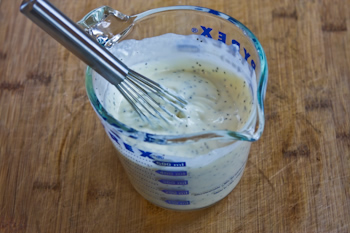 Whisk together the mayo, concentrated shrimp "juice", lemon juice, and celery seed to make the dressing.