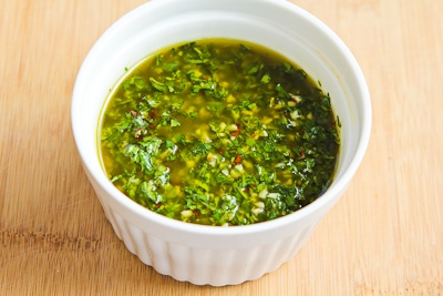 Chimichurri Sauce is a South American condiment for beef that's based on fresh herbs, garlic, and lemon juice or vinegar. You can make it to taste, but we started with a generous amount of chopped cilantro and chopped flat-leaf parsley.