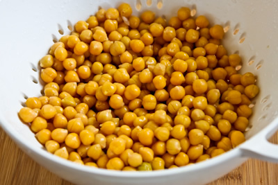 Preheat oven to 375F/190C. Dump chickpeas into a colander placed in the sink and rinse with cold water until no more foam appears. Let chickpeas drain at least 5 minutes. (You can pat them dry with paper towels if they still seem wet after that.)