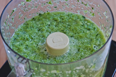 - Put garlic, lemon juice, green bell pepper, and cucumber into food processor fitted with steel blade and process until the mixture is mostly chopped. (This will take a minute or two.)