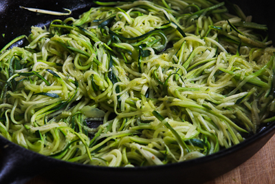 Immediately add the strands of zucchini and cook over high heat, turning over a few times, just until the spaghetti is hot. This was only about 2 minutes for me in a cast-iron pan. Season the "spaghetti" to taste with salt and fresh-ground black pepper.