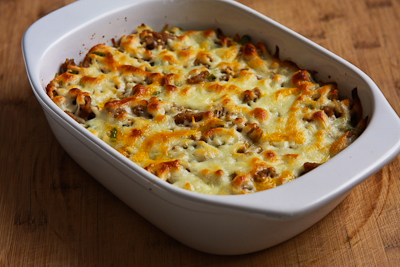 Put the casserole into the oven and bake until the cheese is melted and lightly browned and the whole thing is piping hot, about 20-25 minutes. Serve hot.