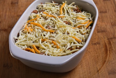 Top with about 3/4 cup of low-fat cheese. I used a four-cheese blend that had 6 grams of fat in 1/4 cup.