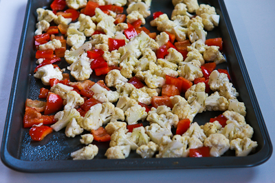 Toss the cauliflower pieces and red bell pepper pieces in a large bowl with olive oil, season to taste with salt and fresh-ground black pepper, and spread them out on a cookie sheet and start roasting.