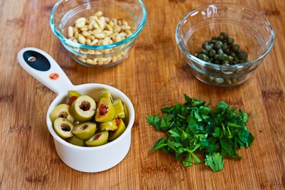I couldn't help increasing the amounts of green olives, pine nuts, and capers in the recipe. And I used the flat-leaf parsley because I had some in my garden, but I'd say you could definitely skip that if you wanted.