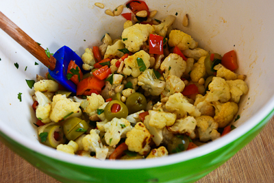 After the cauliflower and peppers have roasted for 20 minutes, put them back in the bowl and toss with the sliced green olives, pine nuts, capers, and parsley (if using). You can add a tiny bit more olive oil if you think you need it, but I didn't.