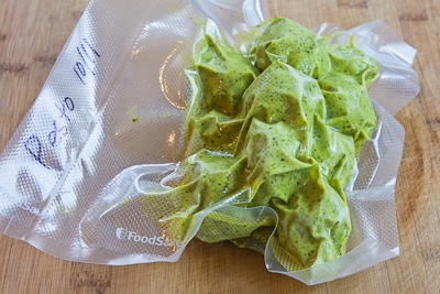 I freeze my pesto in bags that are sealed with a FoodSaver, so the pesto stays good all winter. I freeze it in ice cube trays or mini muffin tins so you can take out a few cubes and reseal the bag.