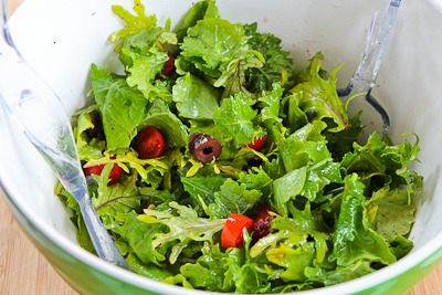 I thought it was fun to cut the Greek olives and cherry tomatoes in slices, because it gave more pieces to get distributed in the salad.