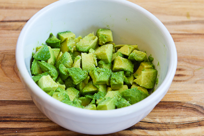 Dice up 2 medium avocados, and toss them with 1 T fresh-squeezed lime juice.