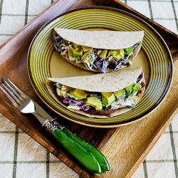 | A beef roast is cooked in the slow cooker with Mexican flavors until it easily shreds apart and then it's made into tacos with whole wheat tortillas, spicy slaw, and avocado. |