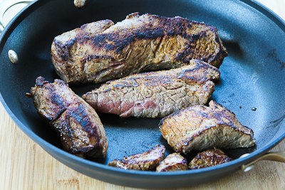 Trim all visible pieces of fat and gristle from the chuck roast and cut it into several pieces. (I save the meat scraps in the freezer to make homemade beef stock.) Rub the pieces of roast all over with steak seasoning. Heat the oil in a heavy frying pan and brown the meat well on all sides, about 8 minutes total browning time.