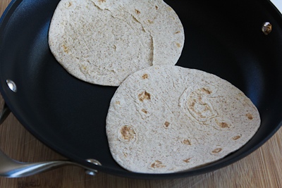 Heat a non-stick pan over medium-high heat and cook the tortillas, turning often. As soon as they start to slightly harden, fold the circle in half to make a taco shell.