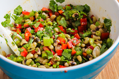 When the peas are well-drained (blot dry with paper towels if you're in a hurry) put them in a bowl and add about 2/3 of the dressing, stirring until all the black-eyed peas are coated with dressing. Add the other ingredients and mix gently to combine, then add more dressing as desired. (If you like your salads on the dry side, you may not need all the dressing.) Let salad chill in the fridge about 30 minutes before serving (if you can wait that long!)