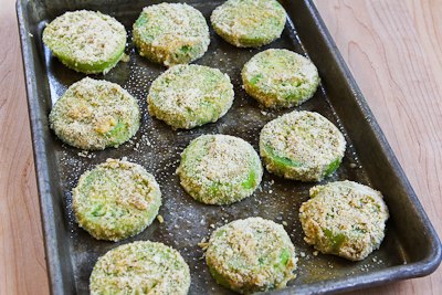 At the farmer's markets here I actually see green tomatoes almost year-round! Crazy. I LOVE this oven-fried version of fried green tomatoes! All the crispy crunchiness...none of the guilty calories.