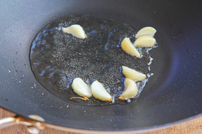 Heat the dry wok over high heat for about one minute, add 2 tablespoons of the oil and heat one minutes more, then add the garlic cloves and cook just until they are fragrant, about 30-45 seconds. (Don't let the garlic brown.) Remove garlic and discard.