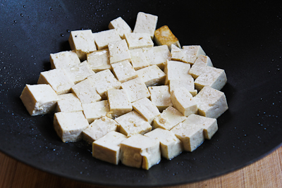 Add the tofu cubes to the seasoned oil and cook over medium-high heat, turning the tofu several times, until all the pieces are well-browned.