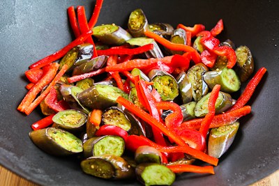 Add another tablespoon of oil as needed, then add the eggplant and stir-fry four minutes. When it's starting to soften and brown add the red pepper strips and cook about 2 minutes more.