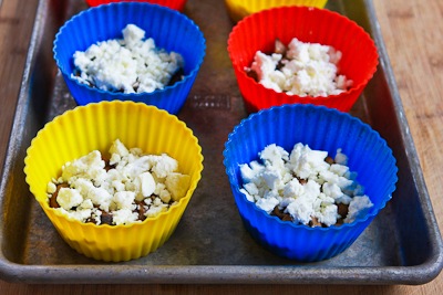 Then make a layer of rinsed cottage cheese and crumbled Feta, divided among the muffin cups.