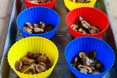 Preheat the oven to 375F/190C, and spray the muffin cups with non-stick spray. Start with a layer of sauteed mushrooms in the bottom of each muffin cup.