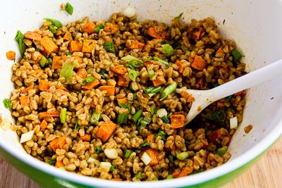 Gently toss together the farro, sweet potatoes, sliced green onions, and the rest of the dressing.