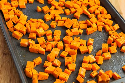 Preheat oven to 400F/200C. Peel sweet potatoes and cut them into half inch dice. Toss sweet potatoes with 1 T olive oil and thyme and season with salt and pepper to taste. Spread sweet potatoes out in a single layer on a large baking sheet (that you have sprayed with non-stick spray or olive oil.) Roast sweet potatoes, turning a few times, until they are softened and slightly browned, about 40 minutes.