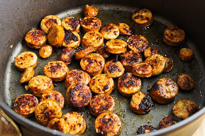I used the Sabatino's Chicken Sausage with Mozzarella, Artichokes and Garlic that I loved with Roasted Sweet Potatoes, but if you can't find those use any low-fat chicken or turkey sausage with garlic. Slice the sausage and saute in a little olive oil until they're well-browned.