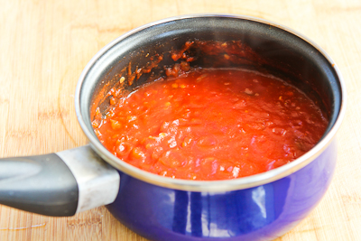 Put 2 cups of salsa into a small saucepan and simmer over medium-low heat until enough liquid has evaporated that the salsa has reduced to 1 cup. (We used medium-heat salsa which was pretty spicy after being reduced; if cooking for kids I would use mild salsa and let adults add hot sauce at the table if they want more heat.)
