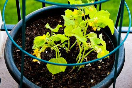 My cucumbers don’t seem to be as happy as the other plants, although they’re loaded with blossoms. After I noticed the plants seemed rather yellow, I started fertilizing them once a week with a small dose of Jobes Organic Water Soluble Vegetable and Tomato Fertilizer, which seems to be helping.