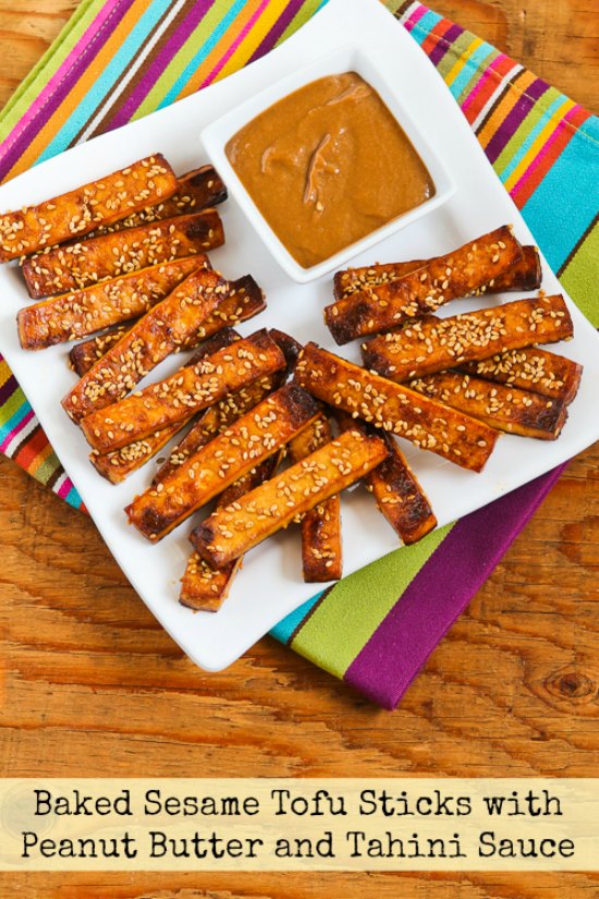 Baked Sesame Tofu Sticks with Peanut Butter and Tahini Sauce are so delicious readers tell me that even the kids will gobble them up! The recipe is vegan and low-carb and can be gluten-free with approved soy sauce.