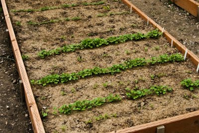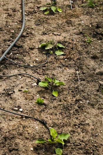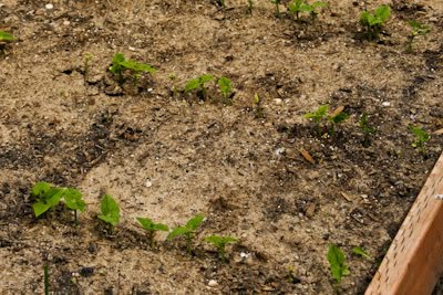 This bed has radishes, Swiss Chard, Collard Greens, and Kale. I didn’t like the radish variety I tried last year, so this year I got Champion Radish. I always grow Bright Lights Chard, and I planted Tuscan Kale, but I didn’t write down the variety for the Collard Greens. All these plants need to be thinned, but before too long I can make Roasted Radishes with Soy Sauce and Toasted Sesame Seed, Whole Wheat Spaghetti with Garlic and Chard, Roasted Kale Chips with Sea Salt and Vinegar, or Pasta with Sausage and Collard Greens.