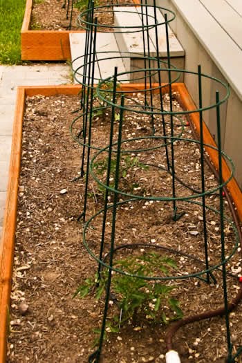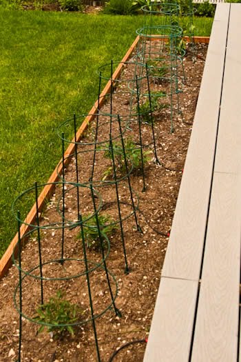 As part of my house renovations, I added two new raised beds just for tomatoes, along the back deck and on either side of the path that leads to my garden. In this smaller bed I have three Green Zebra tomatoes, probably my number one favorite tomato for flavor. I love to eat these just drizzled with Basil Vinaigrette and sprinkled with goat cheese.