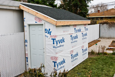 Now we have a door, a window, a roof, and some weather-proofing material that goes under the siding.