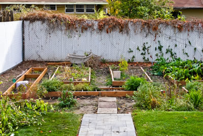 This photo shows the new herb bed moved into place next to the new fence, and the beginning of the weed barrier placed around the beds.