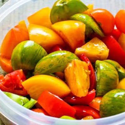 I’m going to help with that in a few hours, after this bucket of Green Zebra tomatoes from my garden gets transformed into a couple of salads for all the movers to nibble on as we work. I raved last year about my love for Green Zebra tomatoes, and this year I’m having an amazing harvest from my three Green Zebra plants. Green Zebras don’t really need more than a little salt to bring out their remarkable flavor, but here are a few other ways I’ve used them.