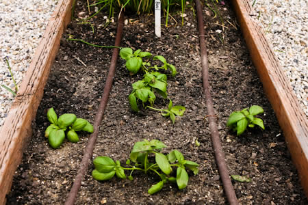 At the other end of that box is basil. I always start with a few plants, and then plant basil seeds all around them. This year I planted Lettuce Leaf Basil seeds, to get basil with really large leaves.