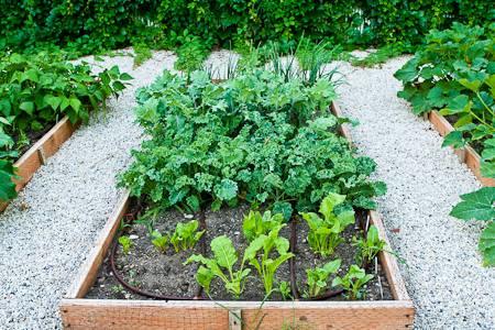 The second bed had bushy radish plants growing on June 24. Next to the radishes chard seeds were planted, but a lot of that first chard planting was eaten by quail. Farther back in this bed is dark kale, Red Russian Kale, and the onions.
