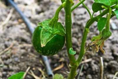This year I’m growing these little Thai eggplants called Kermit eggplant for the first time. (This is a super close-up photo, so this little guy is only a few inches wide so far.)